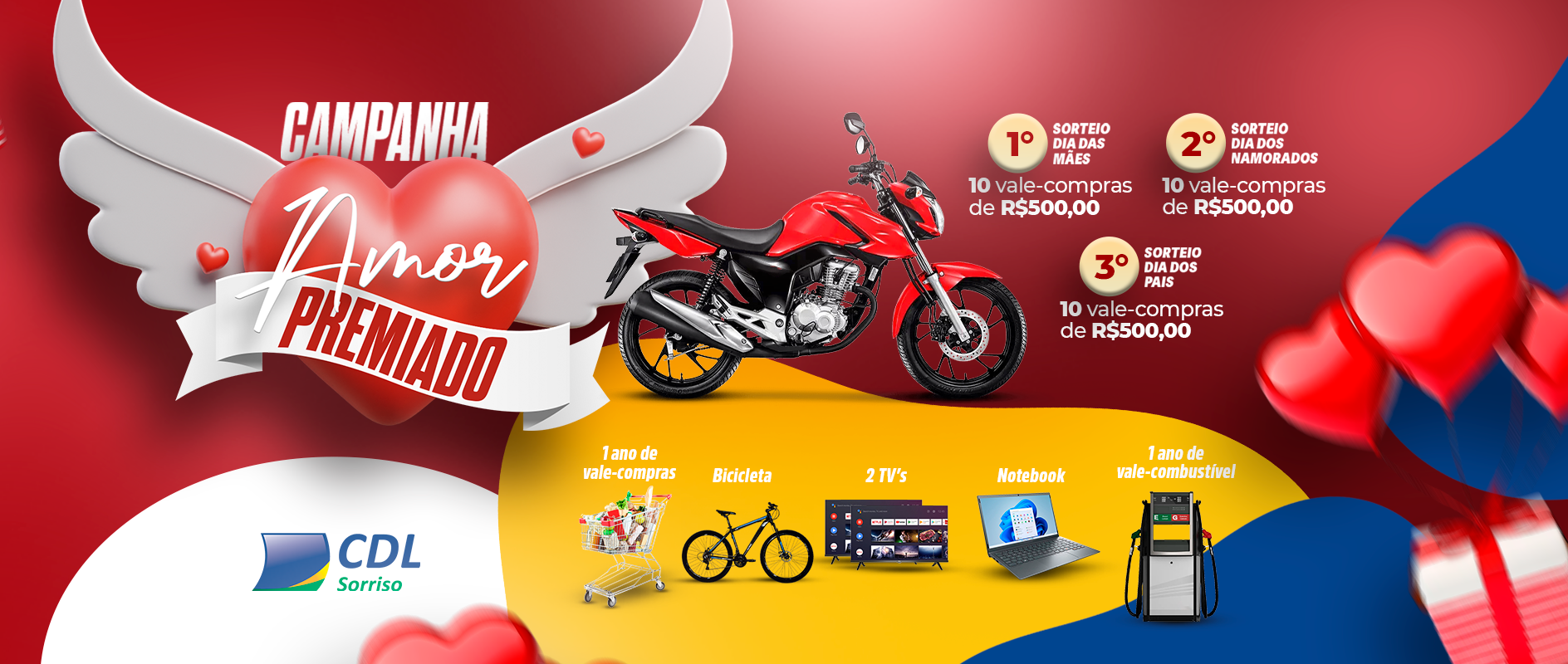A campanha "Amor Premiado" vai homenagear os três grandes amores: o Dia das Mães, o Dia dos Pais e o Dia dos Namorados. E o melhor de tudo é que todas as empresas associadas poderão participar dessa festa de prêmios.